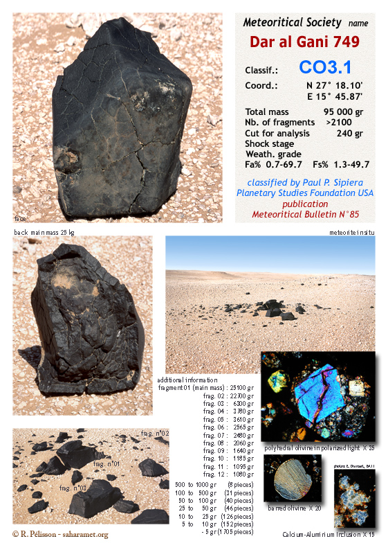 Liste des chondrites carbonées très probablement issuent de la même chute que Dar al Gani 749: DaG 005, 006, 023, 025, 027, 032, 067, 078, 081, 082, 083, 136, 137, 171, 173, 186, 188, 189, 190, 191, 192, 194, 203, 204, 226, 227, 229, 230, 231, 289, 291, 331, 332, 601, 667, 668, 845, 846, 847, 848, 852, 853, 854, 858, 998, 1006...